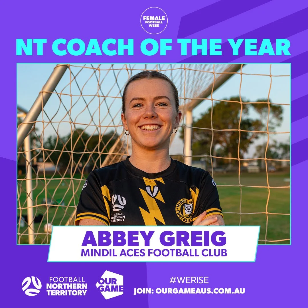 Abbey Greig: Awarded the NT Coach of the Year in the 2024 Female Football Awards, Abbey has experience coaching in the NT and WA from miniroos up to U15s and Division 3 women. Captain of the Women’s Premier League team which won the treble in 2024, she has fostered a coaching style that embodies patience, leadership and unity - a mentor to young players on and off the pitch.